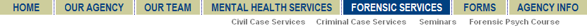 Our Forensic Services Division provides three main classes of expert services: 1) criminal, 2) civil, and 3) litigation / trial consultation services, which can be provided in either criminal or civil cases. We are also pleased to offer informational and continuing education lectures and workshops on forensic mental health topics to attorney groups, courts, law enforcement agencies and interested groups of all kinds. We invite you to view our other forensic web pages for more information.